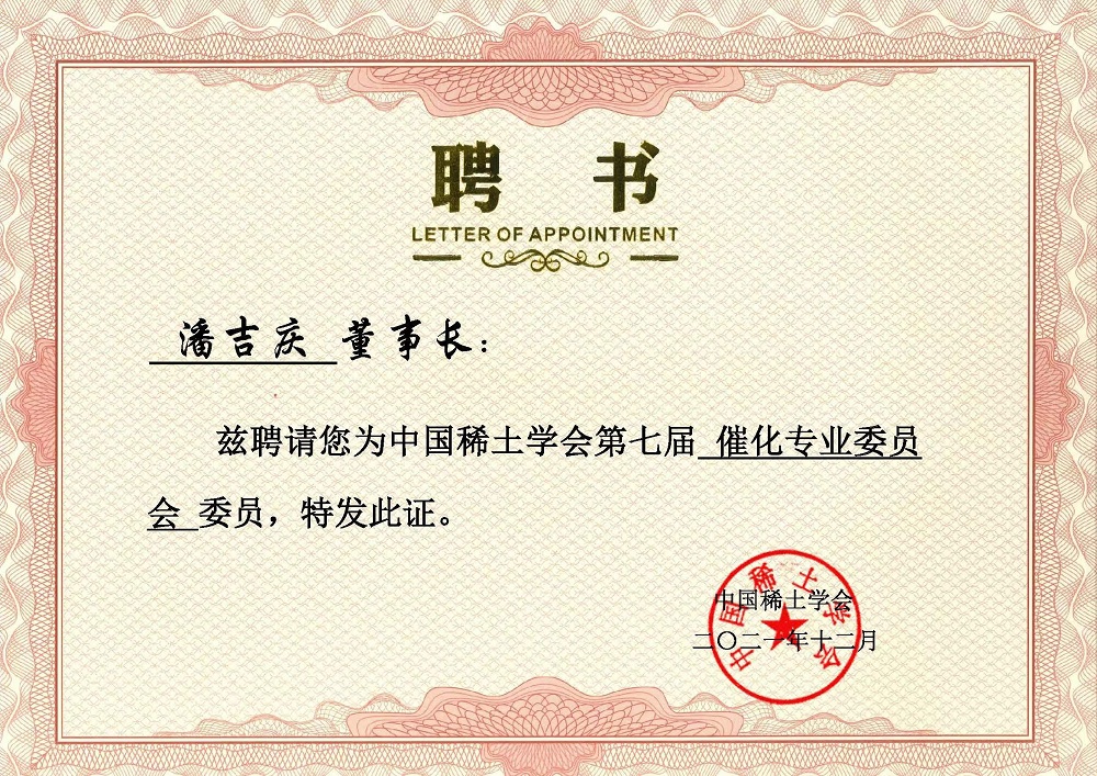 【概要描述】近日,公司董事长潘吉庆先生被中国稀土学会聘为“第七届催化专业委员会委员”。